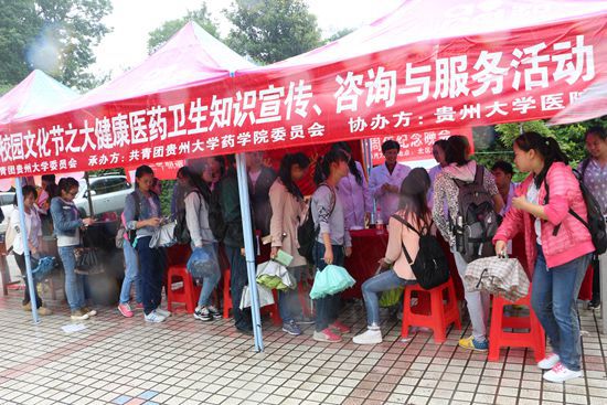 贵大新闻网讯 (药学院 向娅娅 报道|摄影 杨雨 郑榕)为了增加师生对医药卫生知识的了解, 5月22日,以“关爱身心,呵护你我”为主题的“大健康医药卫生知识宣传、咨询与服务”活动在南校区食堂门口举行。该活动由校团委主办、药学院团委承办、校医院协办。药学院党委副书记张豫芳、校医院副院长张满红、校医院科长梁一民、校医院6名医生、护士以及药学院50余名师生参加活动。
