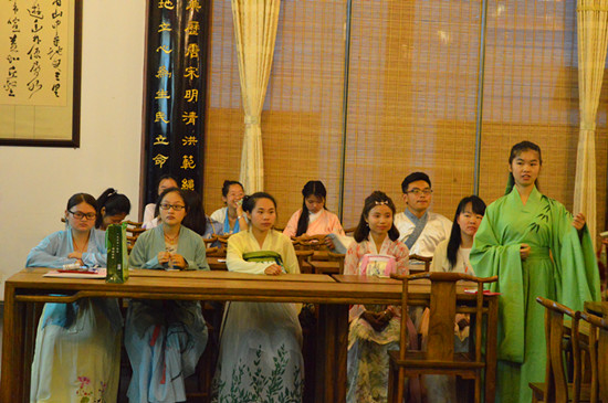 接着,李雪从汉风府的口号开始,着重解读汉服。在全体身着汉服的社员上台后,李雪进行了详细描述:“汉服可分为深衣、袍衫、襦裙、襦袴等,汉服是汉风府区别于其他社团的主要特征。”此外,她对汉服的配饰做了简要说明。