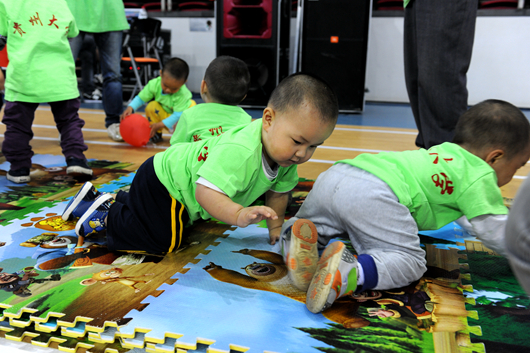 参活动的孩子按年龄分为幼儿组、儿童甲组、儿童乙组分别进行“看谁爬得快”、“蹦蹦跳跳摘糖果”、“青蛙踏荷叶”、“投准”、“生命之旅”等项目,场内氛围十分活跃,在“看谁爬得快”中,还穿着开裆裤的萌宝们以各种神姿势逗得在场的家长哈哈大笑。“生命之旅”中,幼儿组戴眼罩的一方抱着孩子在爱人的陪同下走完全程,儿童组的孩子作为指路人紧紧牵住戴着眼罩的父母的手,带领他们穿越“山川”“河流”,全程无交流,仅凭父母孩子的信任共同克服重重障碍。
