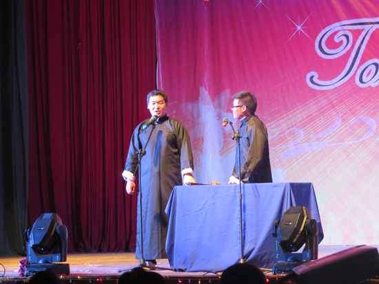 继歌曲串烧、B-BOX T台秀之后,大型民族舞蹈《中国妈妈》将晚会推向高潮,引得在场不少观众感动落泪,而由生态专业毕业生李贵阳和搭档献上的相声《我的大学生活》则令人忍俊不禁。之后的诗歌朗诵表达了毕业生们对母校、恩师以及同窗的不舍与感激之情。