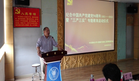 贵大新闻网讯 (大数据与信息工程学院 摄影报道) 为庆祝党的94周年诞辰,教育引导广大党员坚定信念、牢记使命、充分发挥党支部和党员的战斗堡垒和先锋模范作用,7月1日下午,大数据与信息工程学院(以下简称大数据学院)党委在博学楼报告厅举行了庆祝中国共产党建党94周年暨“三严三实”专题教育启动仪式。副校长赵德刚出席了此次会议,大数据学院党政领导干部、各科室负责人、教工党支部书记、本科生、研究生党总支书记及全体教职工党员参加了会议。