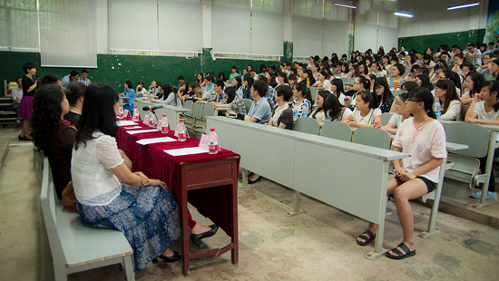 贵大新闻网讯 (外国语学院新闻中心 刘思喆 邓元柳 摄影报道) 7月7日,外国语学院与阳明学院在北校区法阶三举办2014级外语大类学生交接工作师生见面会。副校长向淑文,外国语学院党委书记白震、院长周杰、阳明学院党委书记余颖、院长张寒松以及相关院领导及学生科老师出席大会。
