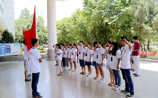 仪式上,杨未首先为两支实践队伍授旗,参加交流周活动的20名学子面向队旗宣誓。