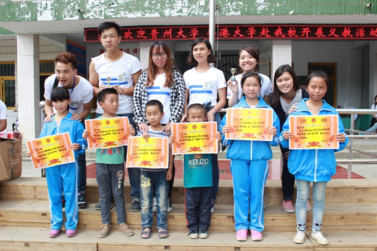 贵大新闻网讯 (记者团 张红梅 报道|摄影 杨隆曼)为了增添义教期间的欢乐气氛,拉近志愿者与孩子们的距离,培养孩子们的团队合作精神,7月23日,在义教的第六天,贵州大学和香港大学义教志愿者在西北小学开展校园趣味运动会。