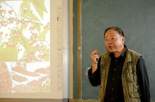 樊卫国教授向农户作《多彩贵州•立体发展•特色水果》的精彩讲座。樊教授用平淡浅显的方言、抑扬顿挫的语调向大家分析了迤那发展特色水果的优势条件,学习借鉴贵州其它地区发展特色水果的成功经验,他指出,迤那可以发展冰糖李、车厘子、刺梨、核桃等优质水果,同时还需引进企业,用农民+企业+科技人员+政府的发展模式,实现脱贫致富。