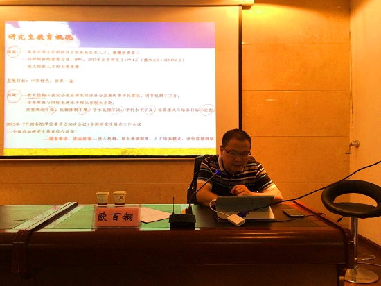 贵大新闻网讯(图/文 记者团 洪文杰) 8月27日上午,国务院学位办处长欧百钢在我校管理学院三楼报告厅作了题为“做好合格评估,建设一流学科——近期学位与研究生教育改革重点”的报告。副校长赵德刚主持报告会。