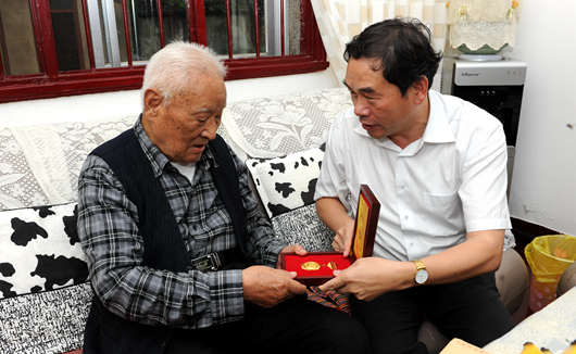 为了纪念这些老同志为抗战做出的贡献,9月3日“大阅兵”前夕,校党委书记陈坚率领部分校领导分别看望慰问了明德修、赵文波、马连玉、李冠文、贾磊、王希尧、段全贵、耿玉轩、贺兰皋、钟涛、董毓镜、孔广生等同志,为他们送去“中国人民抗日战争胜利70周年纪念章”并发放慰问金,感谢他们为革命做出的无私贡献,祝愿他们保重身体、安享晚年。