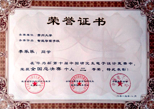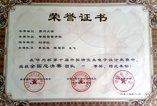 在8月11日到14日举行的“华为杯”第十届中国研究生电子设计竞赛全国总决赛上,大数据与信息工程学院的刘宇红教授指导的两支队伍以西南赛区一等奖的优秀成绩晋级全国总决赛。经角逐,由我校研究生李乐乐、陈冠宇、王飞组成的“宇恩智思”代表队获全国总决赛团队一等奖,李乐乐获个人二等奖,刘宇红教授获“优秀指导老师”称号。