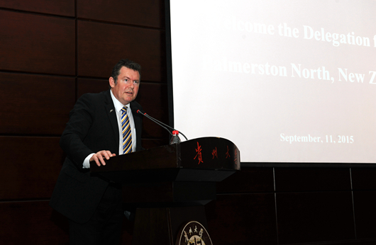 校长郑强致欢迎辞。他表示,随着国家综合实力的不断增强,贵州已逐渐成为国家发展的重点地区之一,贵州大学地处西南地区具有很多后发优势,吸引力已逐渐显现。梅西大学与贵州大学除了合作多年外,在许多方面也存在很多相似之处,希望双方今后能不断加强合作,为北帕市与贵阳市,梅西大学与贵州大学的发展作出积极贡献。