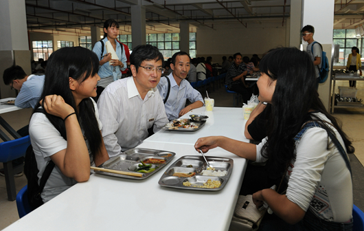 一行人首先来到西区四食堂就餐,郑强校长拿着餐盘到学生后面排队,主动与学生一桌吃饭,了解学生吃住满意度。随后,郑强校长又与来自山西、新疆两位同学交流,询问是否满意校区环境,叮嘱阳明学院院长张寒松认真做好今年新生的入学教育。走在刚建好的宽阔大道上,郑强校长与随行人员,一同讨论校内自行车设施建立的可行性。与几个来自海南、云南的学生交流时,郑强校长表达了对大一新生的殷切希望,深情告诫新生要好好学习,争取考研、出国学习,并表示,贵大将努力把有进取心的孩子们送出去。饭后,新生纷纷前来与郑强校长合影,有新生表示特别希望听到郑强校长的报告。