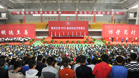 贵大新闻网讯(记者 田鑫 庞爱忠)正衣冠,感恩礼,开笔礼。10月10日上午,古今结合、庄严隆重的贵州大学2015级本科生开学典礼在体育馆举行。校领导陈坚、郑强、宋宝安、王红蕾、杨伟民、骆长江、杨未、金道超、汪海波、向淑文、李军旗、张覃、谢田凯出席。校党委副书记杨未主持。