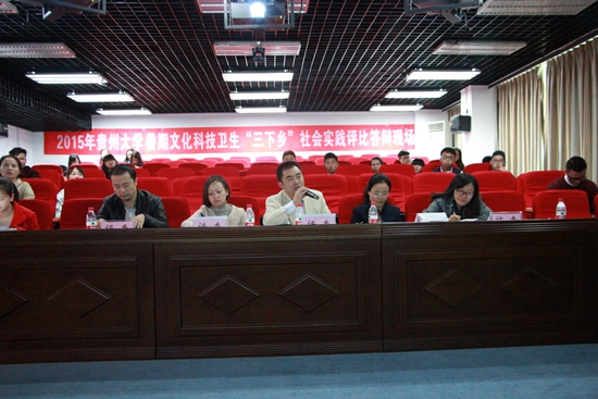贵大新闻网讯(记者团 朱孟洋 摄影报道)10月10日,由我校团委主办的2015年贵州大学学生志愿者暑期文化科技卫生“三下乡”社会实践评比活动在慎思楼实训实验室举办。评比活动由我校学生处处长郭林桦、团委副书记左柏洲、贵大科技园副园长张华、资助管理中心副主任郑岚、化工学院副书记杨静、旅游与文化产业学院副书记王丽担任评委。