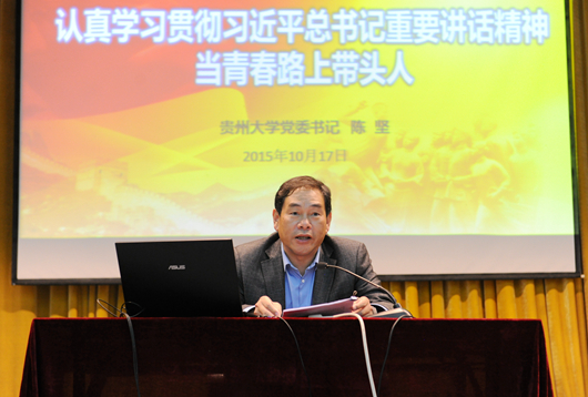 贵大新闻网讯(记者团 苏明明 杨明 报道|摄影 陈恒)10月18日上午,校党委书记陈坚在北区大礼堂为党员发展对象作 “认真学习贯彻习近平总书记重要讲话精神 当青春路上带头人”的集中学习培训。
