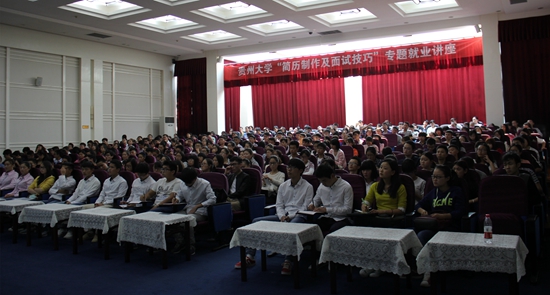 贵大新闻网讯 (记者团 王名润 报道|摄影 孙丽)10月21日下午,“简历制作及面试技巧”专题就业讲座在北校区1号行政楼报告厅举行。中国人民大学人力资源管理硕士、上海右方猎头公司创始人郭霁萱(May Guo)从HR的角度为200余名大学生传授简历制作及面试技巧。本次讲座由我校招生就业处主办,是第二届职场精英挑战赛的组成部分之一。