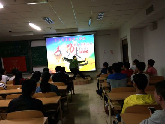 见面会前半个小时,此次见面会主持人付光义给在场的成员播放协会里前辈们以前比赛的视频,他说“进来零基础没关系,我们大家都是这样过来的,在武术指导老师陈晓梅的指导下你们会变得强的。”