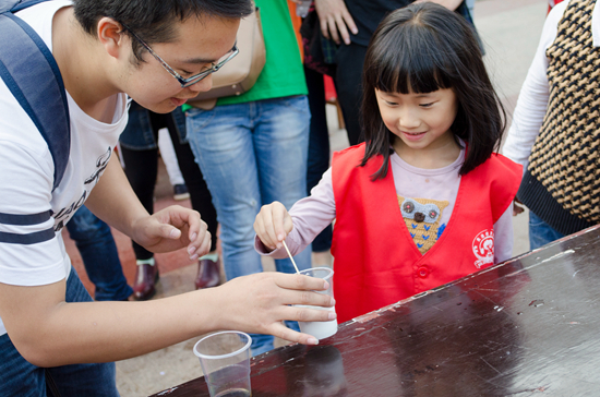 回到大礼堂,化工学院的同学们准备了化学实验“变色的淀粉”与“会喷的可乐”以及游戏“齐心协力吃苹果”与“心有灵犀一家人”,为小朋友讲解生活中的化学小常识,并进行有奖游戏互动。