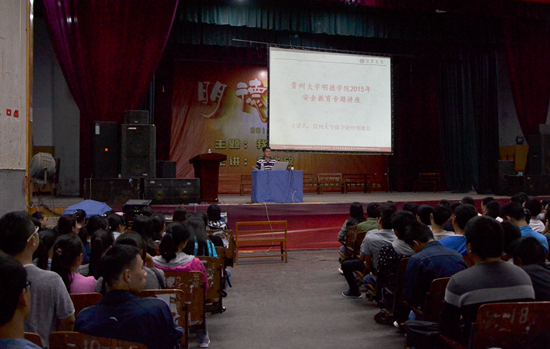 贵大新闻网讯 (记者团 陈飞宇 实习记者 王耀赏|摄影 黄月亮)10月27日晚,由明德学院主办、明德学院学生科和院团委承办的“2015年安全教育专题讲座”在南校区大礼堂开讲。明德学院辅导员王明中、韦雅菁等以及明德学院所有新生参加了这次讲座。讲座的主讲人是贵州省辅导员培训基地特聘专家、我校保卫处处长、辩论赛导师叶明。