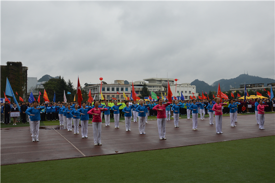八点四十五分,离退休工作处代表队的成员们精神矍铄,昂首阔步地向主席台走去。他们的表演包括上肢运动、肩部运动、扩胸运动等八套动作。当《阿瓦人民唱新歌》的音乐响起,教师代表进行健体操的第六节腰腹运动,与印度舞相近的舞姿赢得了全场观众的阵阵欢呼和掌声。音乐毕,他们面带微笑地向全场观众鞠躬、致意。