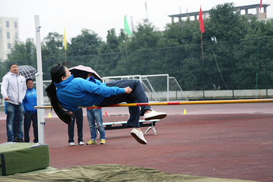 参赛教工们首先面对的是0.9米高挑战,丙组老师李会群,黄世清在试跳中以跨越式动作为主,试跳三次失败后退出。但,试跳的失败没有让两位老师出现负面情绪,相反,她们积极为场上其他的参赛者加油打气,提出建议,不时进行调侃。谢芙蓉老师在0.9米的挑战中小碎步助跑并始终目视前方,成功越过,但1.0米挑战中遗憾失败,参赛教工们依旧予以掌声。