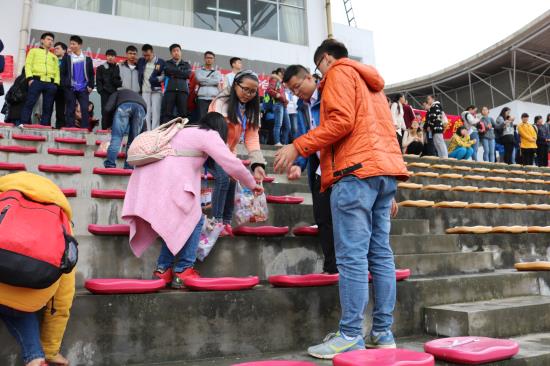据在场同学反映,观众台上方只在卫生间处设置了垃圾桶,并且第一天比赛时,并未设置,过道周围出现了较多垃圾,加之阴雨天气,观众台上不少贴纸脱落,被遗弃在上面。目睹这一现象,阳明学院学生会志愿服务队的同学主动承担起了维护现场整洁卫生的任务。