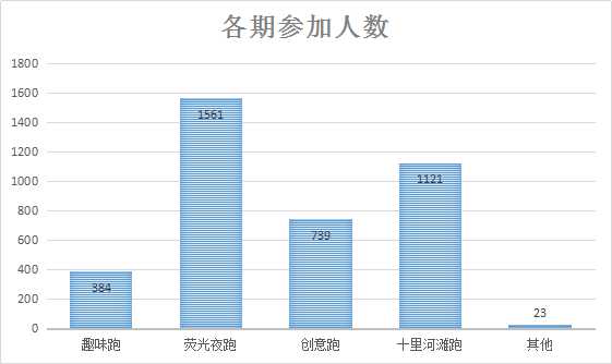四期“迷马”分别以“趣味跑”、“荧光夜跑”、“创意跑”和“十里河滩跑”不同主题分别展开。其中,荧光夜跑参与人数最多,为1561人,占比为39.73%“第一期趣味跑人数相对较少,原因可能是我们的宣传还不到位,同学们对我们的活动还不是很了解。”“迷马”策划小组的负责人朱孟洋说,“但接下来的三期我们联合了部分学院、社团,一起参与,取得了不错的效果。”