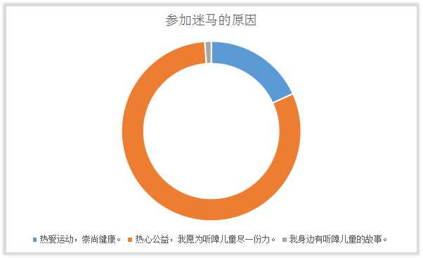 在线上报名系统上有“我为什么参加迷马挑战”一项结构性调查。其中,选择“热心公益,我愿为听障儿童尽一份力”的人数最多,为3088人,占比为80.67%。选择“热爱运动,崇尚健康”和“我身边有听障儿童的故事”的人数分别为696人和44人,占比分别为18.18%和1.15%。