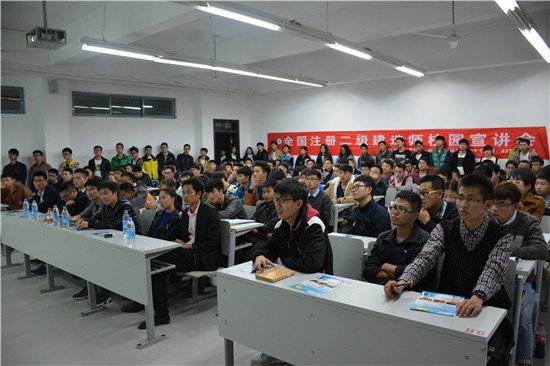 贵大新闻网讯 (记者团 邓亮 实习记者 田爽 宋林锦 报道|摄影 张家豪) 11月18日,由我校校学生会主办的以“建造筑梦人生”的国家注册二级建造师宣讲会在西校区东楼109D教室开讲,巨飞教育讲师钱柚伍担任主讲人,来自各学院大约150名同学参加。