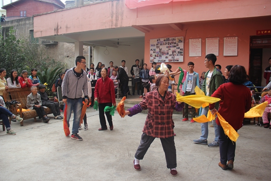而后,志愿者们又为老人表演他们精心编排的节目。在志愿者们跳《小苹果》时,一位老人也进入队伍共演。虽然她对舞蹈动作并不熟悉,但仍认真模仿志愿者们的姿态扭动身躯。一曲舞毕,观众们掌声雷动。唱歌环节中,不少老人要求高歌一曲。他们所唱的大多是带有自己时代记忆的红歌。而令全场观众沸腾的是,一位志愿者还跟老人合唱了一段《红灯记》里面的《我有一颗红亮的心》。最后,院长建议大家一起活动,志愿者们就跟老人们在大院子里伴着音乐、伴着老人们的笑声扭起了秧歌。