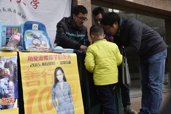 相关链接:“善行100”是指志愿者周末在指定活动地点发起劝募,爱心人士的捐款将用以购买温暖包和美术包,捐款200元购买温暖包,捐款100元购买美术包,最少捐款额为100元。温暖包内有棉衣、帽子、手套等,美术包内有水彩笔、橡皮泥等十几样文具。会以包裹的形式寄送给贫困地区的小朋友。标准的包裹内容也让捐款更加透明。