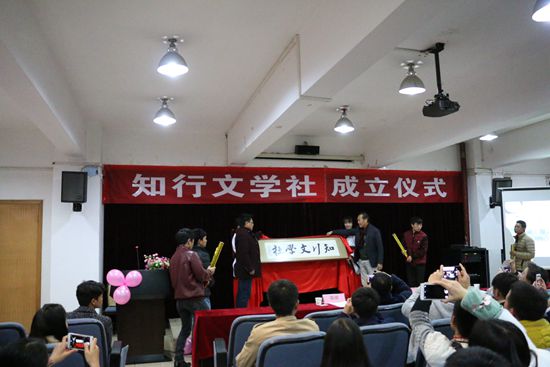 尹晓莉老师上台发表致辞,她首先表达对知行文学社成立的祝贺并说:“我们的文学社才刚刚起步,希望大家可以在这个的平台上创造出体现当代大学生阳光,健康的文学作品,努力成为推动校园文化气息的一份子,文学社的明天需要大家不惧前进的艰难,迈开稳健的步伐,从而开启多彩的人生。”在欢呼声中,郭思思秘书长、郭龙翔副书记共同为知行文学社举行成立揭牌仪式,并由知行文学社首任社长陈宗发为名誉指导老师颁发了聘书。