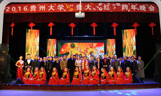 晚上,21点,由共青团贵州大学委员会主办,校艺术团承办的“2016‘贵大红’跨年晚会”在北校区大礼堂举行。校领导陈坚、郑强、宋宝安、王红蕾、杨伟民、骆长江、杨未、金道超、赵德刚、汪海波、向淑文、李军旗、张覃、谢田凯出席晚会。本次“贵大红”跨年晚会共有“跨年红”,“岁月红”与“中国红”三个篇章。艺术学院的《水姑娘》以柔美的舞蹈展示了女子水一般的柔媚;国际教育学院的留学生送上了墨西哥秘鲁舞蹈表演与老挝舞蹈《愉快的农夫》;人文学院带来了话剧《甄嬛传》,虚拟了清宫内选拔贵大跨年晚会人选的情节,引得场内笑声不断。