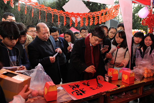 下午16点开始,北校区、西校区和南校区新春游园会拉开帷幕,贵州大学各社团纷纷拿出自己社团的“看家本领”,展示各自社团的风采。笑声连连的德云社相声表演,动作酷炫的跑酷社表演。很多社团都推出了各自活动,成语接龙、你画我猜、舞文弄墨对对联等各式各样的精彩活动不断上演。期间陈坚书记和郑强校长也亲临现场参与社团活动,猜字谜、听相声,并预祝同学们元旦快乐。