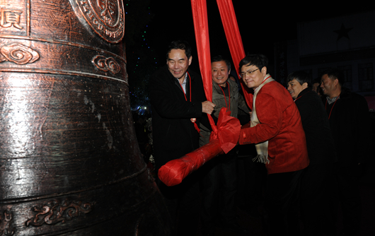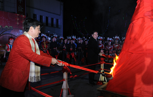 晚上23点,篝火晚会正式开始。在独具苗族特色的文艺表演后,校领导点燃了象征着青春激情的跨年篝火。23时59分,全场在主持人的带领下开始了倒计时——“十,九,八……三,二,一!”礼炮声,欢呼声与祝福声不绝于耳,校领导也随即敲响了新年的钟声。并向在场师生们发放了“圆蛋”礼物,与身着民族盛装的演员围篝火齐跳芒筒芦笙舞。