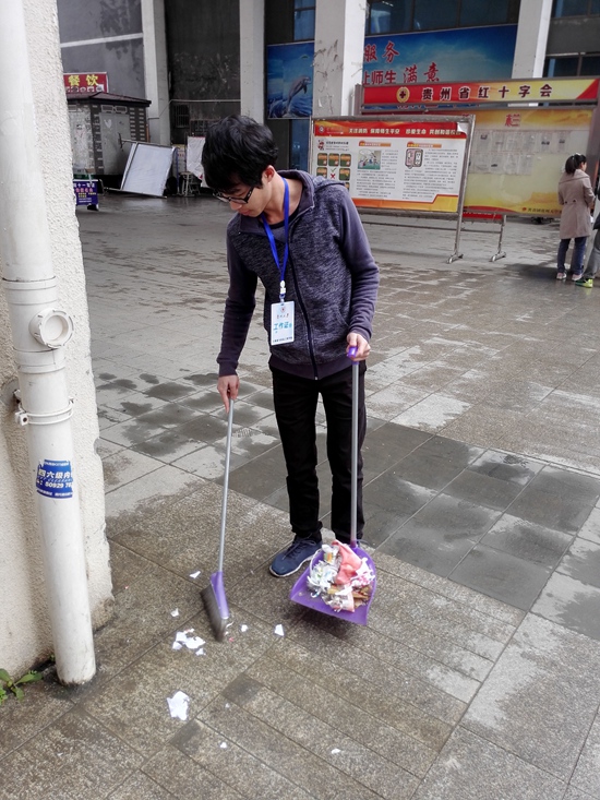 随即,同学们分别前往贵大北区、东区进行校园卫生清理和打扫等学习雷锋精神活动。过程中,大家拿着小刀,撬下粘贴在校园角落墙壁上的小广告,提着小桶拾起散落地上的垃圾。