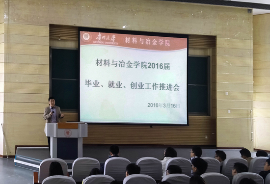 贵大新闻网讯 (记者团 陈磊 摄影报道) 为推进学院毕业生就业工作的开展,解决毕业生就业方面的难题,3月16日中午,材料与冶金学院在新校区圆形报告厅召开了2016届毕业生“毕业、就业、创业”推进会。学院党委副书记张瑞良,学生辅导员先桁与学院2016届全体毕业生参加了本次会议,会议由先桁主持。