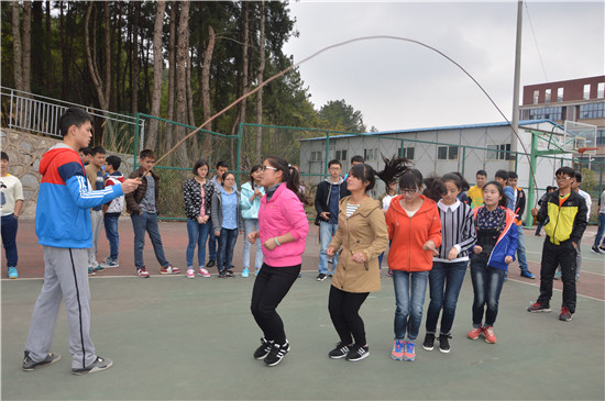 接下来“托球跑”比赛,选手们拿着放有乒乓球的球拍进行接力,若球掉下则回到原点重来,此项比赛考验人的平衡和相互之间的协作,勘技132的参赛选手将球拍倾斜快速运球,利用风力使得球稳定在球拍上,在此环节夺得第一。“跳大绳”比赛,每班派出7人,两人负责摇绳,5人负责跳绳。环科141的队员们最终拿得此项第一。