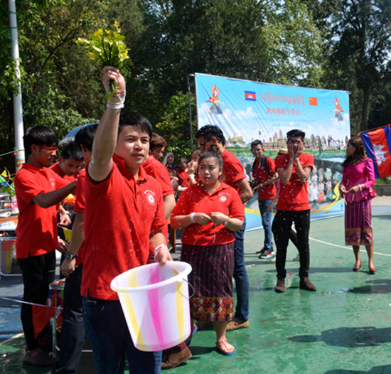 最后大家一起玩柬埔寨游戏,边玩边唱歌,场上欢声一片。随后,留学生在八号公寓门口开始了激烈的“泼水节”,有用杯子泼的,也有用大瓢直接倒的。场面热闹至极。