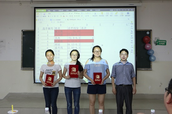 本次比赛2号选手刘力荣,4号选手庹鑫鑫,1号选手董文艳分别荣获一,二,三等奖。戴老师颁奖并合影留念。