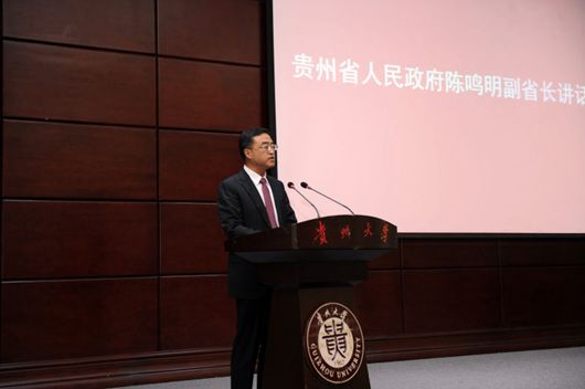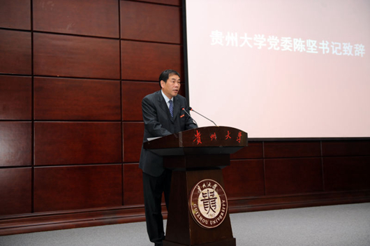 贵州大学党委书记陈坚致辞,他介绍了近几年来贵州大学在教育部、财政部和贵州省委省政府、教育厅的大力支持与指导下,办学条件明显改善、学科建设实力显著增强、教育教学质量稳固提高、科技创新取得重大突破等几个方面的发展和取得的成就。