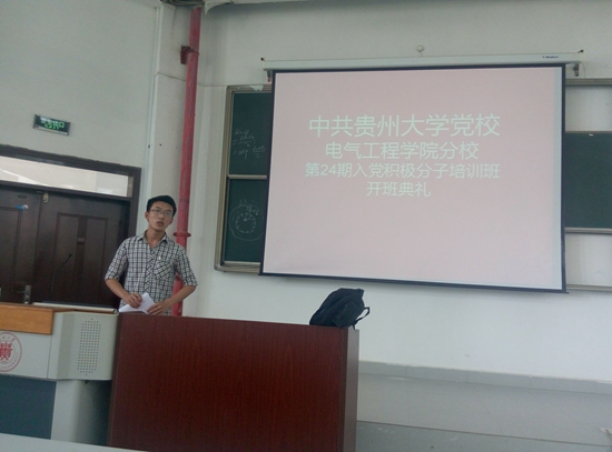 贵大新闻网讯(电气工程学院 陈倩 报道|摄影 黄胜) 正值“两学一做”学习教育开展之际,5月11日中午,电气工程学院分党校第二十四期入党积极分子培训班开班典礼在西校区东楼举行。电气工程学院党委书记李庆华参加开班典礼。开班典礼由该学院13级年级助理朱春晓主持。