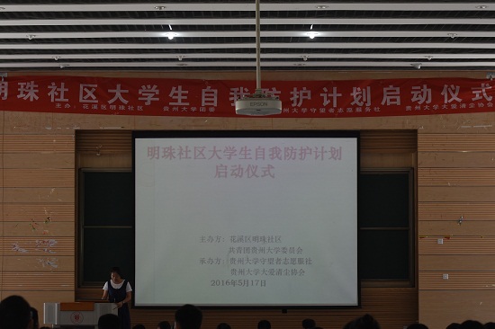 贵大新闻网讯 (记者团 罗庆亚 实习记者 龙金梅 报道|摄影 张雪) 为提高大学生的安全意识和自我保护意识,5月17日中午,由花溪区明珠社区、我校团委主办,我校守望者志愿服务社和大爱清尘协会承办的“明珠社区大学生自我防护计划开启仪式”在新校区圆形报告厅举行。我校团委副书记左柏洲、明珠社区党委书记杜凤琴等人参加了此次活动。