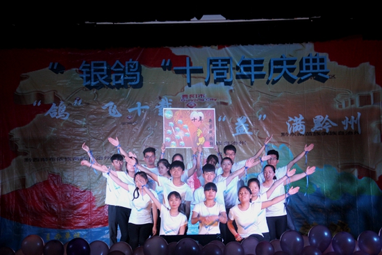 贵大新闻网讯 (记者团 郭丽 熊玉玲 报道|摄影 何小红)5月27日晚, 我校银鸽愿者服务团(以下简称银鸽)“鸽飞十载,益满黔州”十周年庆典晚会在北校区大礼堂举行。社团联合会指导老师廖银,刘锦鸿、花鑫、海德等老鸽友,银鸽部分成员及各社团代表参加晚会。