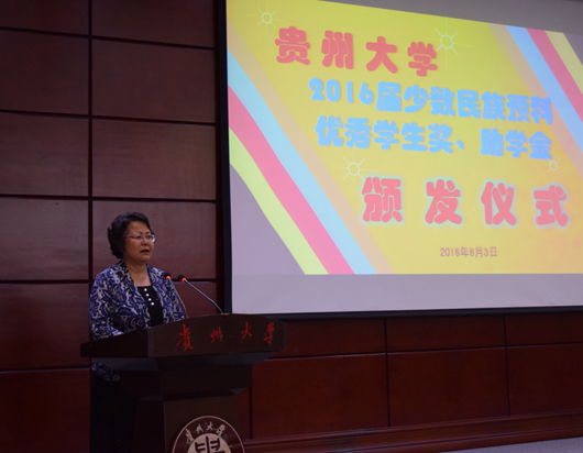 省民委巡视员刘晖做总结讲话。她在发言中指出,数学与统计学院作为贵州大学预科生的具体实施培养单位,充分做到了“尽心、精心和用心”。她还勉励每一位获得奖助学金的同学努力学习科学文化知识,为建设美丽家乡而努力。