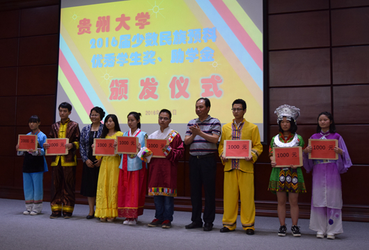 贵大新闻网讯(陈朝东 赵峻峰)6月3日,我校在一号行政楼学术报告厅举行2016届少数民族预科优秀学生奖、助学金颁发仪式。省民委巡视员刘晖、文教处处长黄家逊,校党委副书记杨伟民、招就处、教务处负责同志和身着各民族服装的2016届251名少数民族预科生出席了此次颁奖仪式。