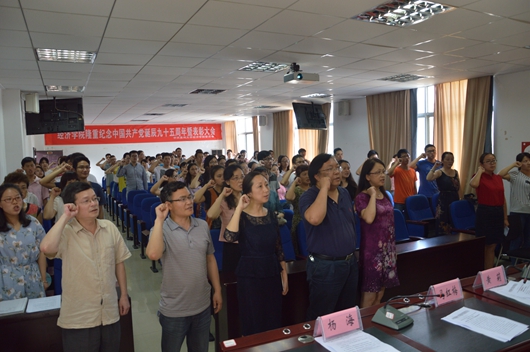 大会在研究生领唱、全体党员合唱歌曲《国际歌》拉开序幕。党委书记黄莉同志以《国际歌》中展现全世界无产阶级大无畏争取人类解放为主题,结合党的95年光辉历程,作了铭记党史,做合格党员的讲话。黄莉还代表学院党委向全体共产党员致以节日的问候,向受表彰的集体与个人表示崇高的敬意,向宣誓的新党员表示热烈祝贺。希望全院师生学习先进、争当先进,不断增强基层党组织的凝聚力与战斗力,为进一步推动经济学院又好又快发展做出贡献。