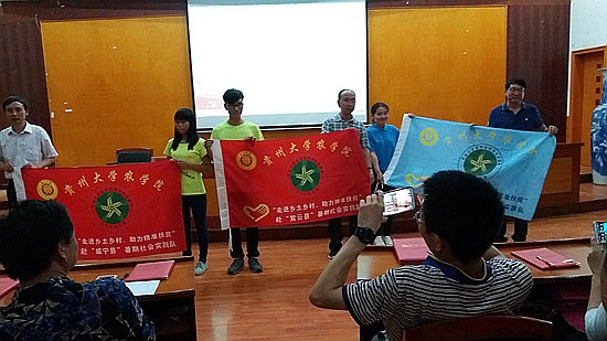 随后,进行了“走进乡土乡村,助力精准扶贫”农学院暑期社会实践启动仪式。本实践活动派出三支队伍,分别奔赴威宁、水城、紫云三个国家级贫困县开展调研、支教、党建和科技服务等支农助农工作。学院党委书记杨刚、院长赵致、副院长程剑平为三支队伍授旗,全体队员进行了出征宣誓。