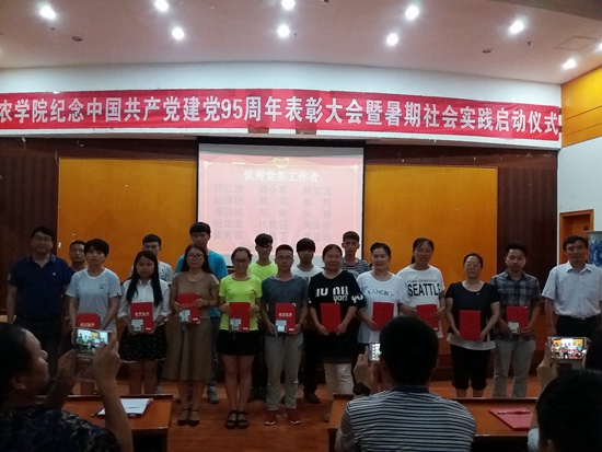 贵大新闻网讯 ( 农学院 江越 谭丽娟 摄影报道)为庆祝中国共产党建党95周年,重温党的光辉历程,深入贯彻落实习近平总书记重要讲话精神,进一步增强党组织的凝聚力和战斗力,6月28日晚,农学院党委在南校区农生楼617教室举行了庆祝中国共产党建党95周年表彰大会暨暑期社会实践启动仪式。学院党委班子成员及院属各党总支、党支部书记,教工及学生党员代表共计150余人参加会议。会议由党委副书记王巩同志主持。