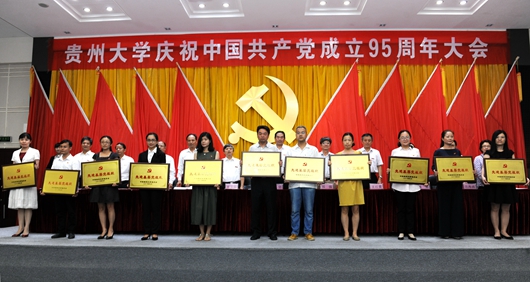 贵大新闻网讯(记者团 严纯 摄影 陈恒)7月5日,贵州大学隆重举行庆祝中国共产党成立95周年大会。校领导陈坚、郑强、宋宝安、王红蕾、杨伟民、杨未、赵德刚、汪海波、李军旗、张覃、谢田凯,党政群部门主要负责人、各基层党(工)委书记、副书记,受表彰党员、党务工作者,新发展党员代表,党支部书记、党员代表,民主党派、无党派人士参加大会。