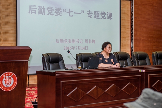 贵大新闻网讯(后勤部 刘一评 报道|摄影 王忠阳) 为进一步引导党员领悟党章、尊崇党章、遵守党章,自觉把党章刻在心上,从而坚定自己的理想信念。后勤党委结合“两学一做”学习教育和学校《关于“七一”前后开展“七个一”活动的工作方案》,7月14日,在北校区双馨园四楼会议室组织集中上专题党课,后勤党委全体党员领导干部、党员和党员发展对象参加了党课,党课由后勤党委书记赵兰同志主持,后勤党委副书记周长峰同志主讲。