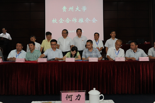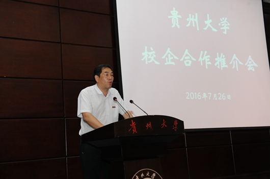 校党委书记陈坚致辞,他指出,高校是人才的聚集地和科学研究的重要场所,贵州大学要发挥人才优势和科研优势,促进科技成果转化,实现产学研相结合,促进科技成果向现实生产力转变,搭建校企共建共赢平台,更好地服务贵州经济社会全方位发展,为贵州同步小康建设贡献力量。